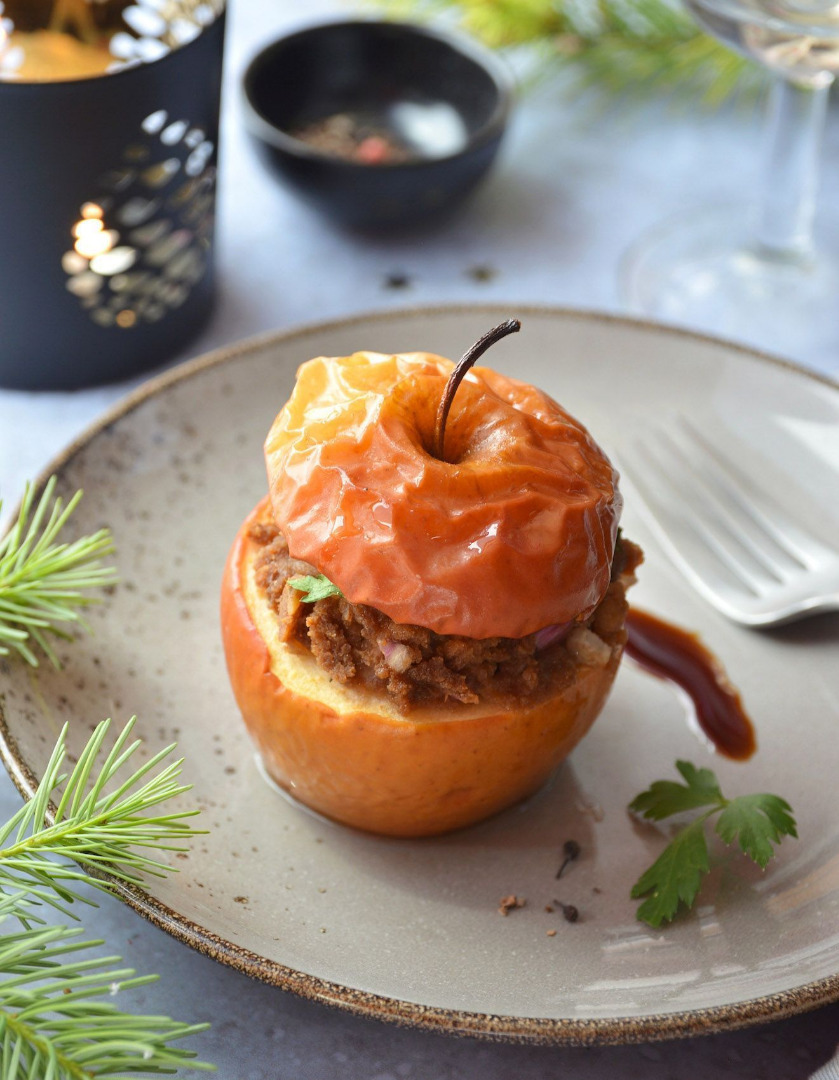 – Garnissez les pommes de farce puis déposez le chapeau au-dessus. Badigeonnez les pommes de beurre fondu, puis placez les pommes dans un plat allant au four. Enfournez pour 30 mins, C’est prêt !